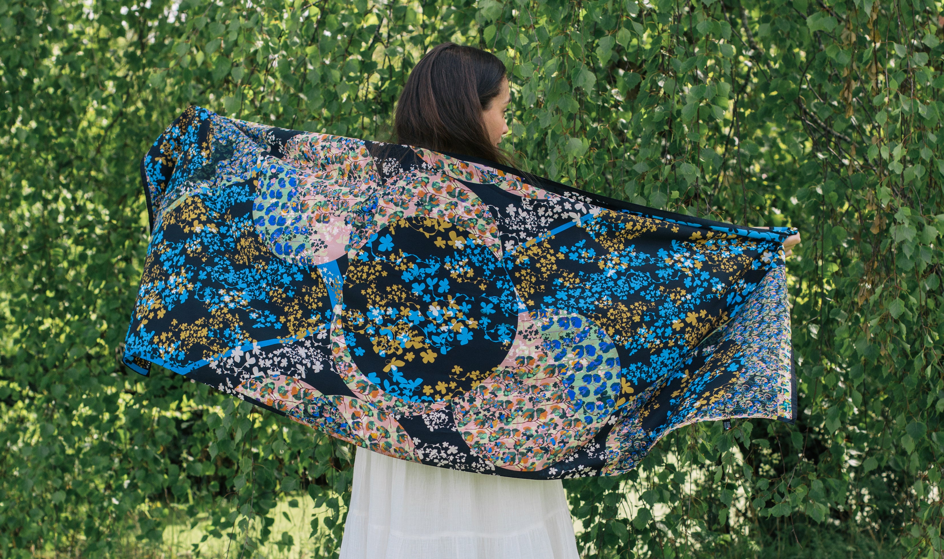 "What a gorgeous scarf: the design is colourful and really elegant when worn; the silk is a beautiful weight and sheen; and the finished edges are done to a very high standard. Love it! Highly recommend (and I will be buying another design)"