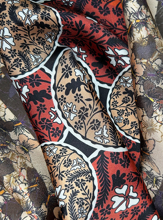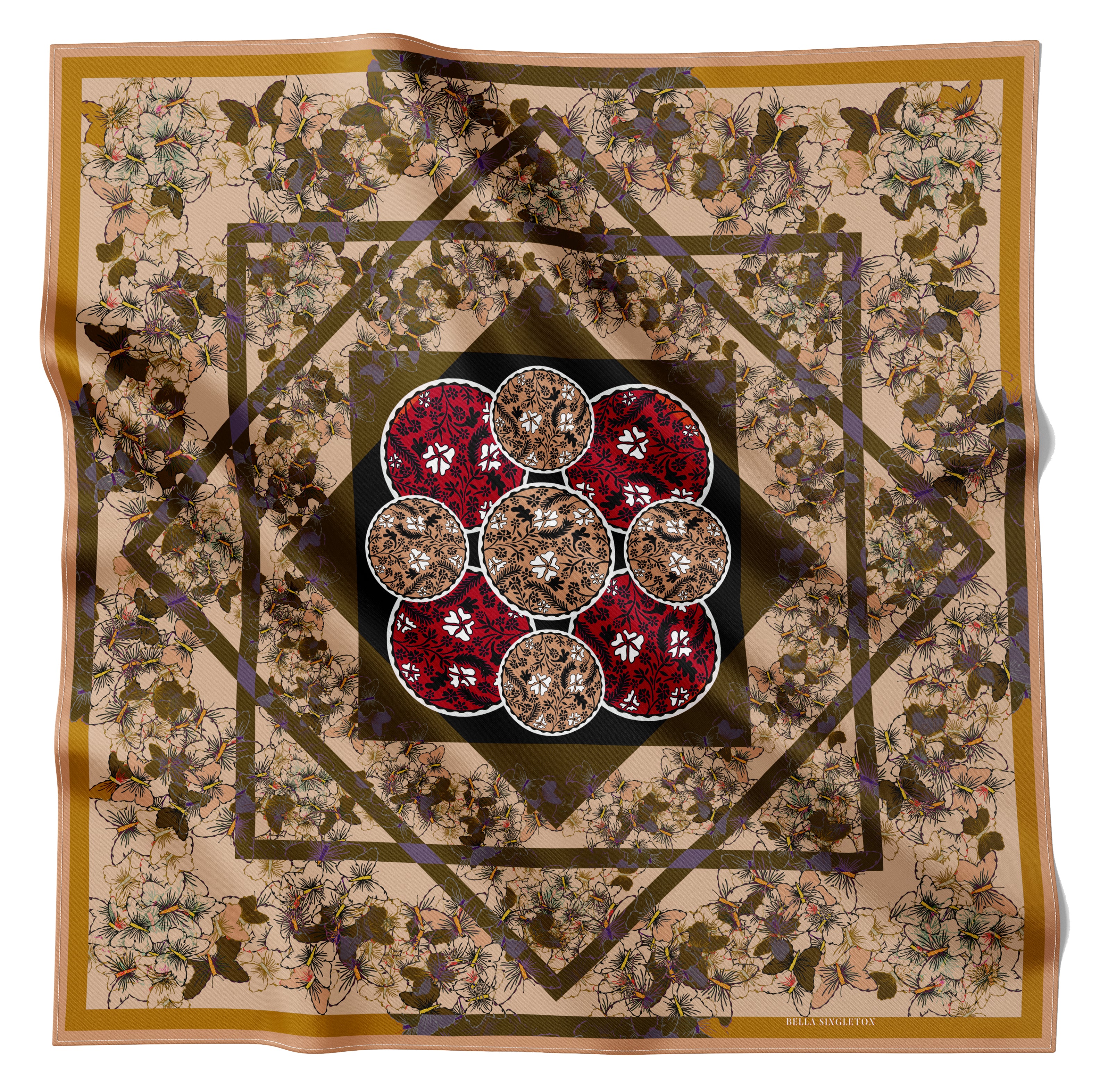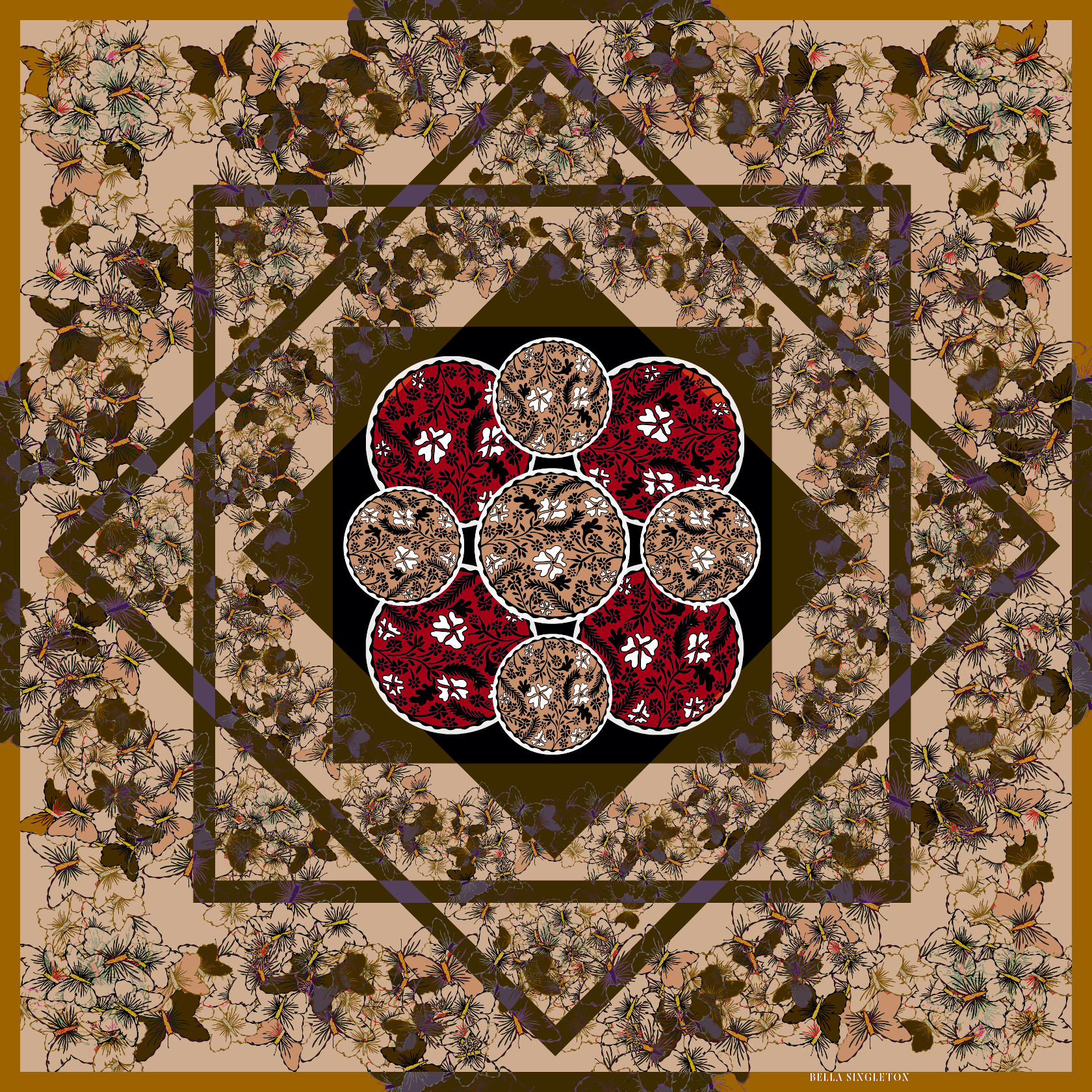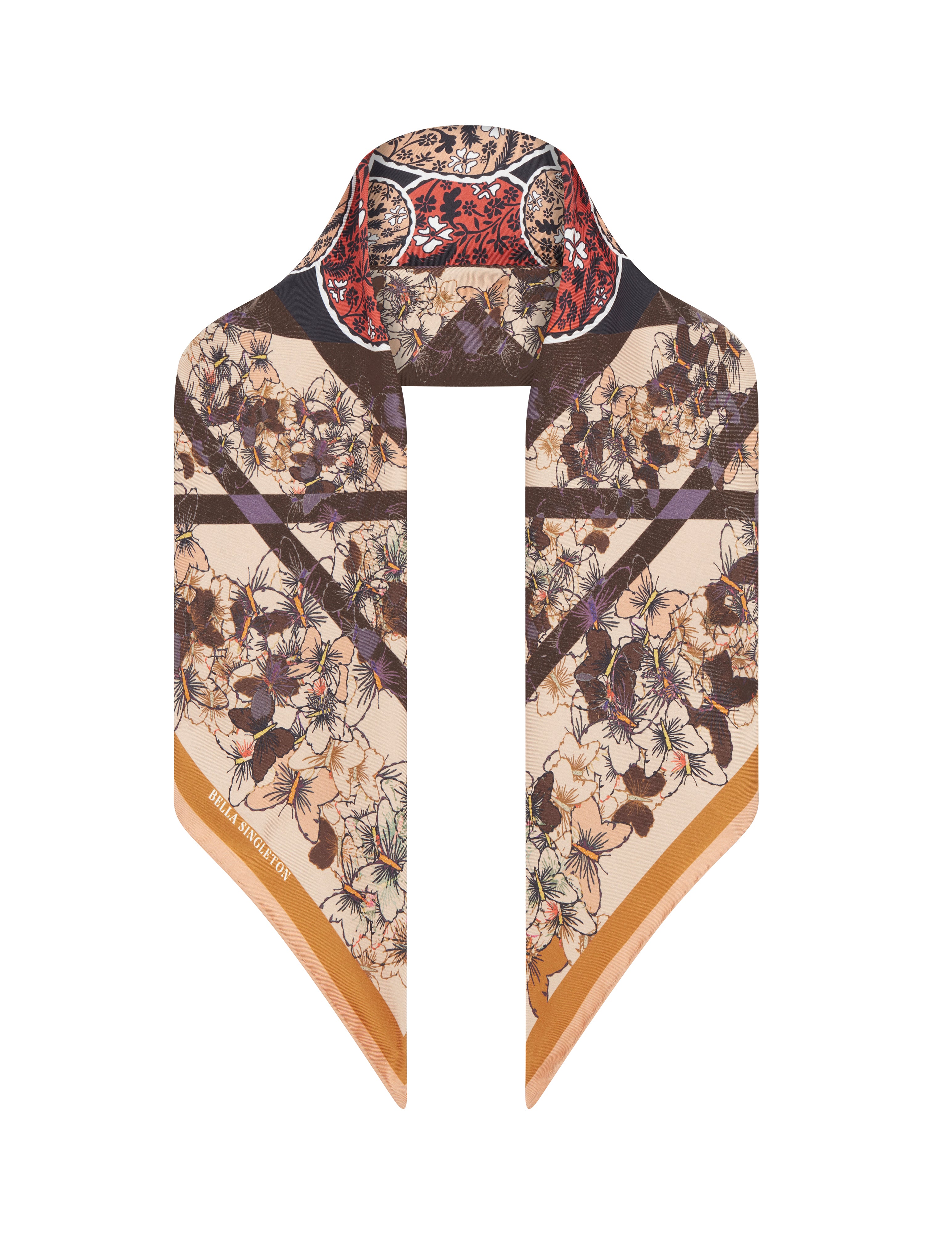 Falling butterflies with a bold central print, this design is full of movement and beautiful warm colours.